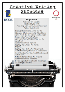 Wednesday I read my short story ‘Five-A-Day Friends’ at the Bolton Octagon theatre as part of their Creative Writing Showcase. It was a very strange experience standing on a stage in the bright lights, but it was great fun! Great work by Jenny Martin, Adam Martin, Tatiana Koutsokoumni, Joanne Powell and Laurette Evans for organising the event (apologies if I missed anyone off that list).