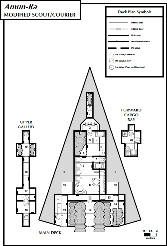 The deck plan preview you can see on the left is the Amun Ra, a modified 100-ton Scout/Courier I designed using Classic Traveller Book 5: High Guard, my favourite Traveller ship design system. I drew the plans in Microsoft Visio, dropping in some Traveller Geomorphs from Robert Pearce.