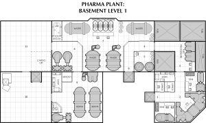 Here’s a set of plans I created for a pharmaceutical manufacturing plant using Robert Pearce’s geomorphs. There are two basement levels and a ground floor, with two points of entry. The plans are fairly generic so you could use them for any kind of medical or scientific base. I printed them out on A1 paper for my players to use with miniatures.