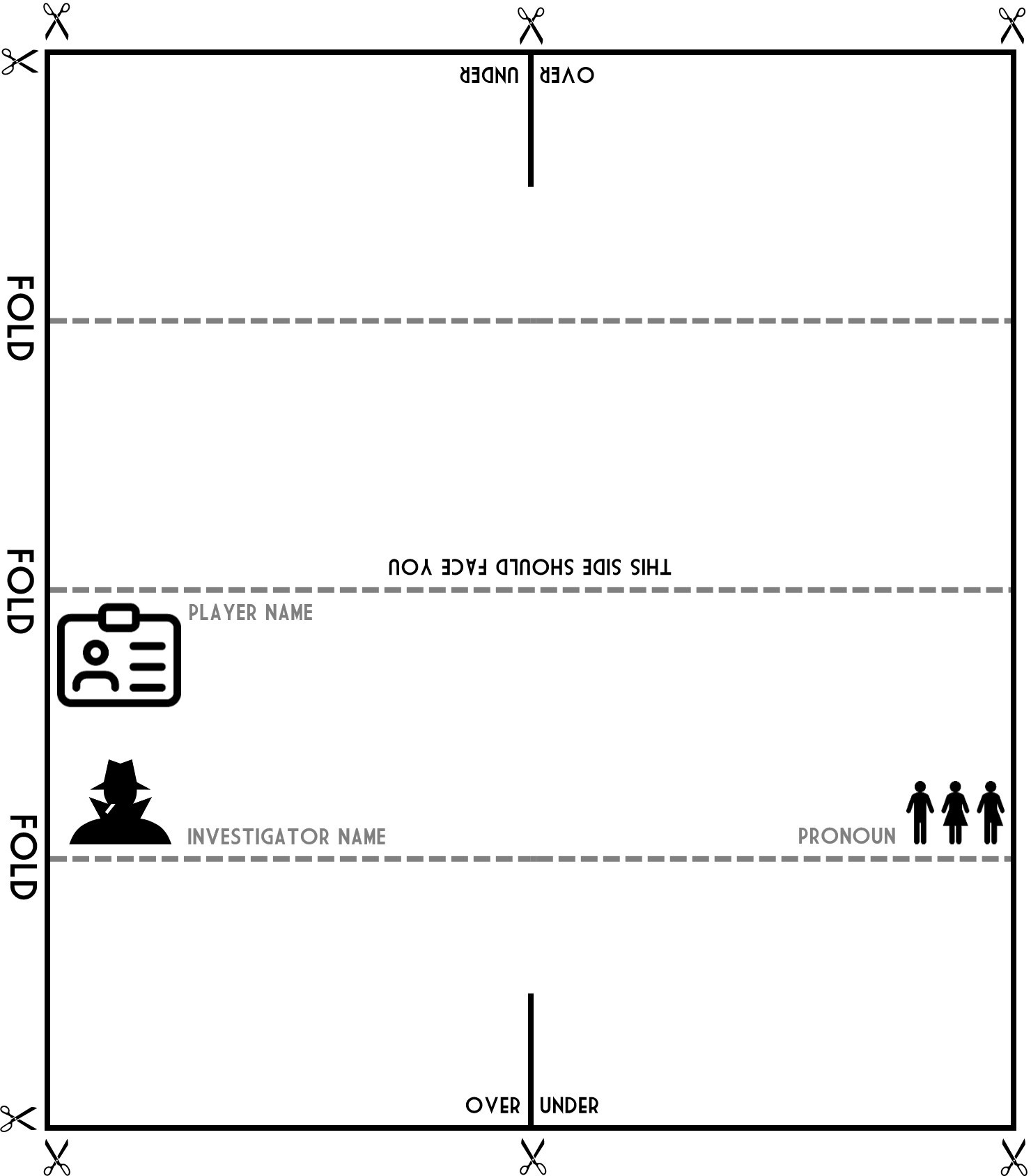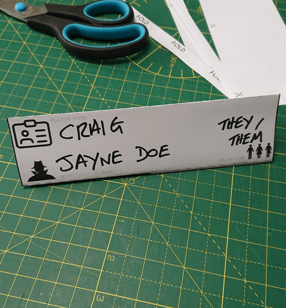 Here’s a game aid I created for Call of Cthulhu: a name card which can be placed on the table in front of each player. Print it out and cut the edges as marked. Players can add their name, their investigator’s name, and any preferred pronoun for themselves and/or their investigator.
