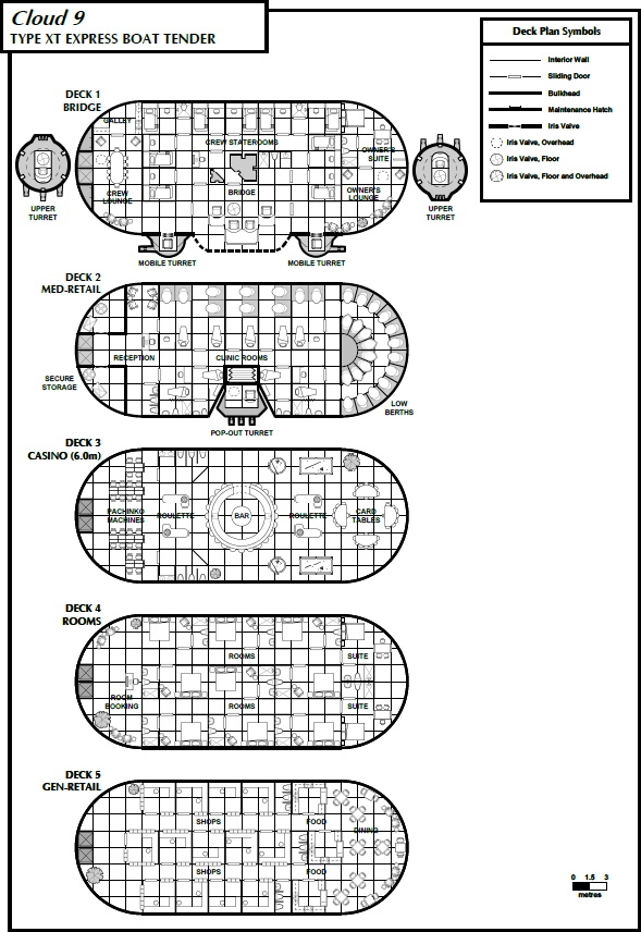 A variety of small craft are arriving or leaving the local area, or parked up in matching orbits. Holo-emitters dotted across the Cloud 9’s hull are projecting advertisements out into space offering everything from nachos to cybernetic implants, casino games to stage shows.